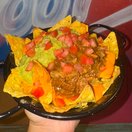 Nachos mexicans, enfornats amb formatge cheddar, coberts de pulled pork i la nostra fondue de formatge cheddar, acompanyats de guacamole casolà i tomàquet fresc.