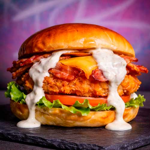 Crispy and juicy breaded chicken breast served on a bed of lettuce and fresh tomato, topped with cheddar cheese, maple bacon, and Ranch Grill sauce on our delicious brioche bun.Chef's Suggestion: Extra grilled red onion.